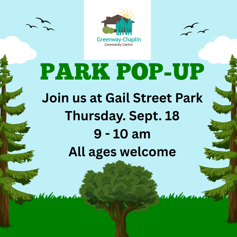 Pop Up & Play (Caregivers & Children) – Tues May 13, 20 and 27, 2025 from 9 to 10:30 at Greenway-Chaplin Community Centre. Snack and activities provided.