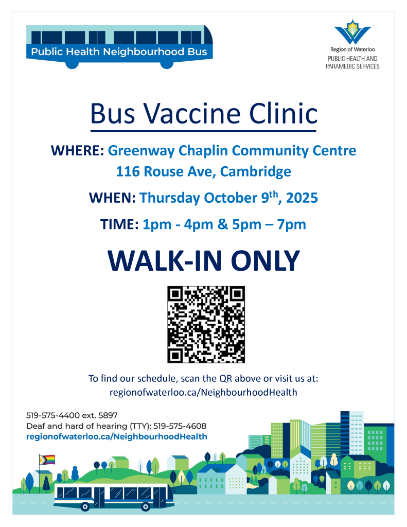 Vaccine Bus at Greenway-Chaplin Community Centre – Thurs. Oct. 9 1-7 pm