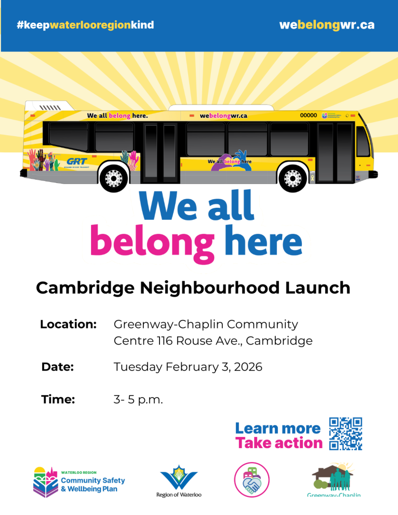 We All Belong Bus Visit at Greenway-Chaplin Community Centre – Join us for hot cholocate and snack and a photo with the We All Belong Bus.